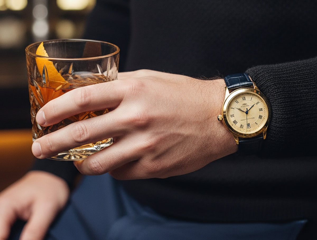 Reloj de caballero con un diseño clásico inspirado en un modelo suizo de 1928. Presenta una carcasa terminada en oro, cara guilloché color marfil y elegantes manecillas azules estilo Breguet. Viene con correa de piel genuina (cocodrilo) en café o negro.