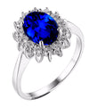 Réplica inspirada en el anillo de compromiso de la Princesa Diana. Cuenta con una montadura sólida de PLATA .925 y lleva un zafiro central creado en laboratorio de más de 6 quilates, rodeado por 14 brillantes.