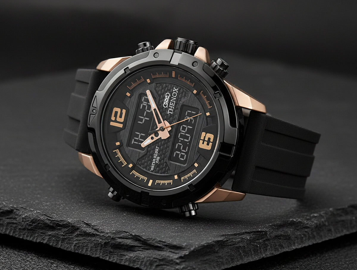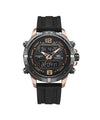 Reloj deportivo híbrido (análogo y digital) con un diseño moderno en acero gloss negro con chapa en oro rosado de 18k. Utiliza maquinaria Japonesa y es resistente al agua 3 ATM. Es una pieza de fabricación meticulosa y en edición limitada.