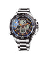 Reloj híbrido (digital-análogo) de edición limitada (300 unidades) con una estructura metálica de alta resistencia. Destaca por su cristal único de coloración azul (Master Blue) y detalles de corona y botones chapados en oro de 18 quilates. Diseñado para ofrecer precisión y durabilidad.